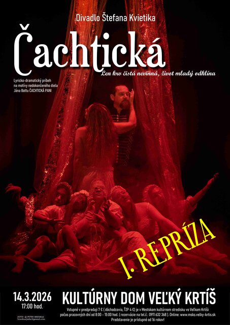Po úspešnom uvedení vás pozývame na 1. reprízu našej novej divadelnej hry ČACHTICKÁ. Ak ste nestihli premiéru, teraz máte jedinečnú príležitosť ponoriť sa do temného, no poetického príbehu o legendárnej hradnej panej. V lyricko-dramatickom spracovaní na motívy nedokončeného diela Jána Bottu vás zavedieme priamo na hrad aj do podhradia. Zažite časy ukrutné, kde v tieni hradných múrov platilo: „len krv čistá, nevinná, život mladý odklína”...