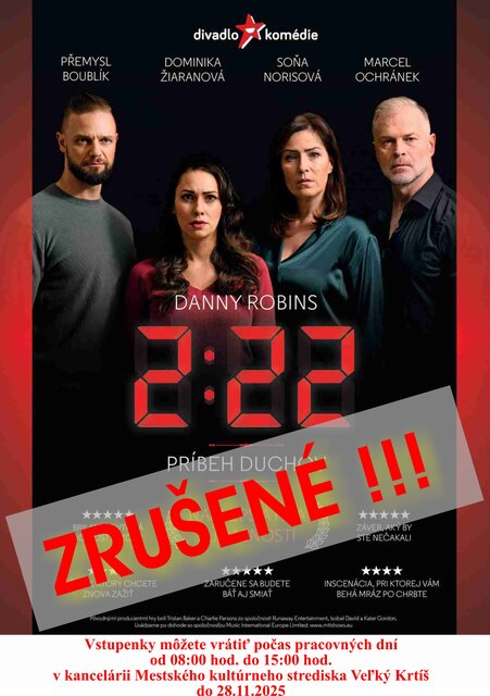 Vstupenky môžete vrátiť počas pracovných dní od 08:00 hod. do 15:00 hod. v kancelárii Mestského kultúrneho strediska Veľký Krtíš od 27.10. 2025 do 28.11.2025.